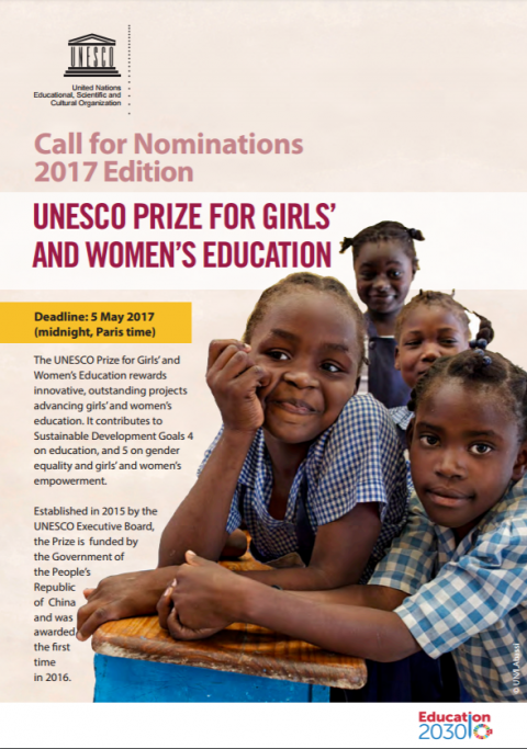 Прием заявок в номинации Конкурс 2017. ПРЕМИЯ ЮНЕСКО ЗА ДОСТИЖЕНИЯ В ОБЛАСТИ ОБРАЗОВАНИЯ ДЕВОЧЕК И ЖЕНЩИН Год публикации: 2017 Организация-автор: UNESCO The UNESCO Prize for Girls’ and Women’s Education rewards innovative, outstanding projects advancing girls’ and women’s education. It contributes to Sustainable Development Goals 4 on education, and 5 on gender equality and girls’ and women’s empowerment.