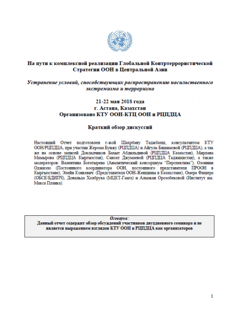 На пути к комплексной реализации Глобальной Контртеррористической Стратегии ООН в Центральной Азии Год публикации: 2018 Организация-автор: United Nations Regional Centre for Preventive Diplomacy for Central Asia (UNRCCA) Отчет рассматривает условия распространения насильственного экстремизма и терроризма в Центральной Азии. Отчет является результатом семинара, организованного ООН/РЦПДЦА в Астане, Казахстан