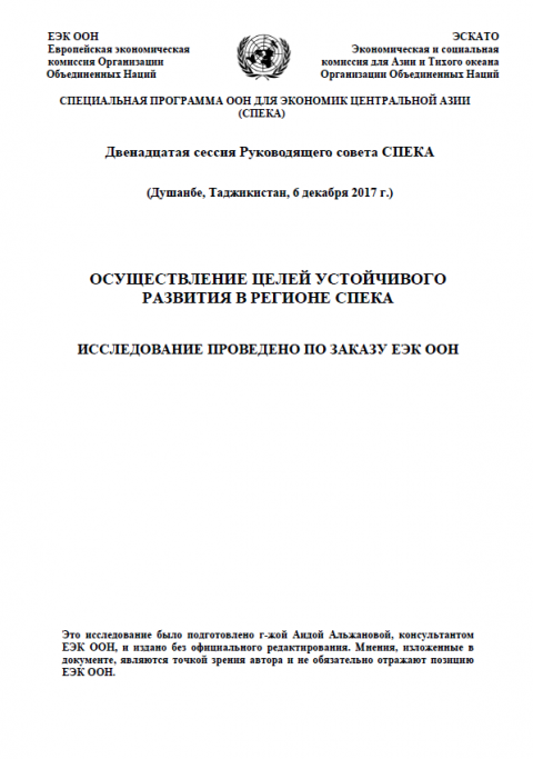 Осуществление целей устойчивого развития в регионе СПЕКА Год публикации: 2017 Организация-автор: United Nations Economic Commission for Europe (UNECE) Данное исследование направлено на анализ связей между работой по достижению Целей устойчивого развития (ЦУР) в национальных рамках стран, участвующих в Специальной программе ООН для экономик Центральной Азии (СПЕКА) и определение областей, в которых будет полезно сотрудничество этих стран в рамках СПЕКА. Анализ приведет к выработке политических рекомендаций относительно того, как региональное сотрудничество в рамках СПЕКА может способствовать прогрессу в реализации ЦУР.