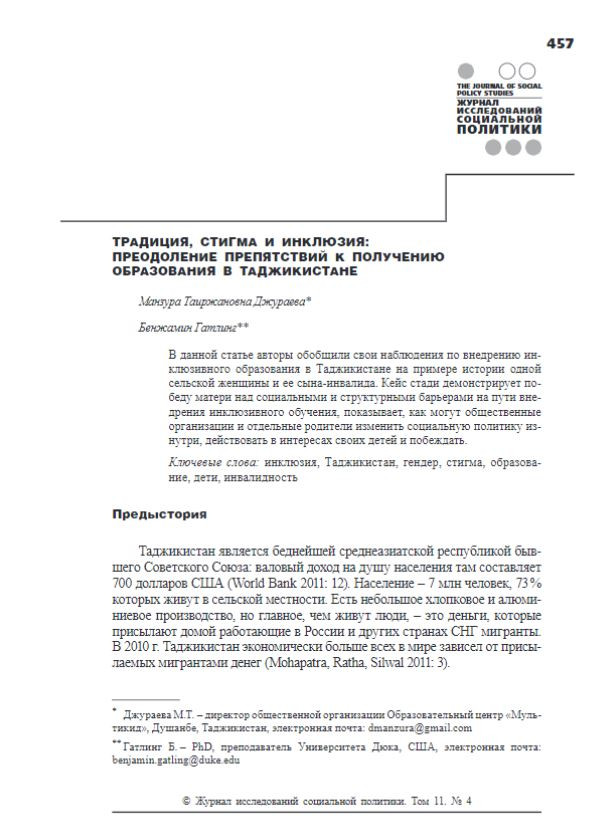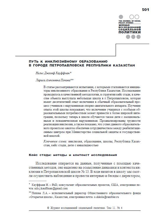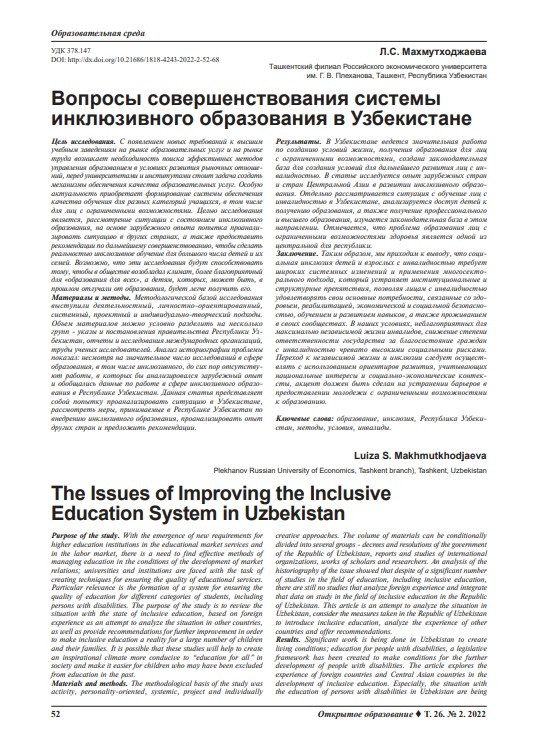 Вопросы совершенствования системы инклюзивного образования в Узбекистане (Открытое образование; vol. 26, no.2) Год публикации: 2022 Автор: Makhmutkhodjaeva L.S. В статье исследуется опыт зарубежных стран и стран Центральной Азии в развитии инклюзивного образования. Отдельно рассматривается ситуация с обучение лиц с инвалидностью в Узбекистане, анализируется доступ детей к получению образования, а также получение профессионального и высшего образования, изучается законодательная база в этом направлении. Отмечается, что проблема образования лиц с ограниченными возможностями здоровья является одной из центральных вопросов для республики.