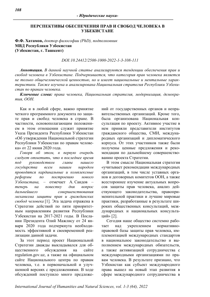 Перспективы обеспечения прав и свобод человека в Узбекистане Год публикации: 2022 Автор: F.F. Khatamov В данной научной статье анализируются тенденции обеспечения прав и свобод человека в Узбекистане. Подчеркивается, что категория прав человека является не только общечеловеческой ценностью, но и имеет национальные и ментальные характеристики. Также изучена и анализирована Национальная стратегия Республики Узбекистан по правам человека.