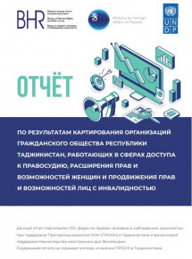 Отчёт по результатам картирования организаций гражданского общества республики Таджикистан, работающих в сферах доступа к правосудию, расширения прав и возможностей женщин и продвижения прав и возможностей лиц с инвалидностью Год публикации: 2022 Организация-автор: Бюро по правам человека и соблюдению законности Картирование проведено общественной организацией «Бюро по правам человека и соблюдению законности» в рамках проекта ПРООН «Укрепление верховенства закона и прав человека с целью обеспечения возможностей для реализации прав людей в Таджикистане», финансируемого Правительством Финляндии, с целью определения ОГО, работающих в сфере продвижения прав человека, расширения прав и возможностей женщин и вопросов инвалидности», осуществленного при поддержке ПРООН в Таджикистане с целью определения ОГО, работающих в данных сферах, для доступа заинтересованных лиц и организаций к информации о деятельности данных организаций и их контактам, а также для дальнейшего повышения их потенциала.