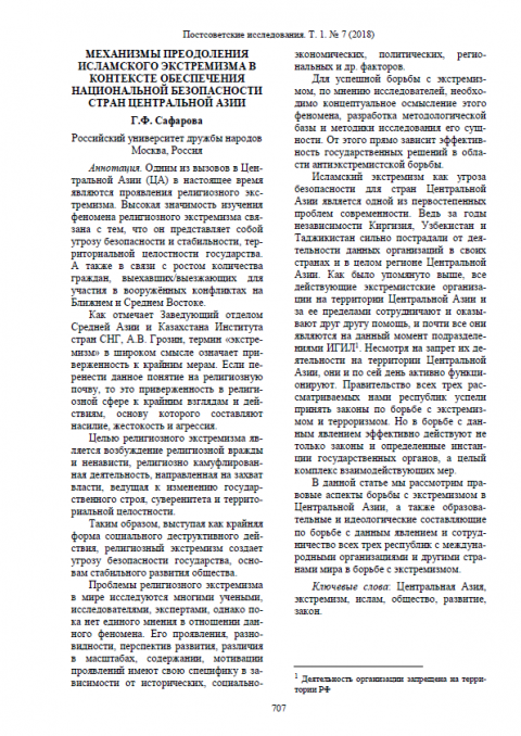 Механизмы преодоления исламского экстремизма в контексте обеспечения национальной безопасности стран Центральной Азии Год публикации: 2018 Автор: Gandzina F. Safarova В данной статье мы рассмотрим пра-вовые аспекты борьбы с экстремизмом в Центральной Азии, а также образовательные и идеологические составляющие по борьбе с данным явлением и сотруд-ничество всех трех республик с междуна-родными организациями и другими стра-нами мира в борьбе с экстремизмом.