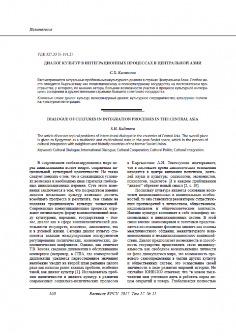 Терроризм и религиозный экстремизм в Центральной Азии: проблемы восприятия. Кейс Казахстана и Кыргызстана Год публикации: 2016 Автор: Anastasiya Reshetnyak В этой статье рассматриваются актуальные проблемы межкультурного диалога в странах Центральной Азии. Особое место отводится Кыргызстану как полиэтническому и поликультурному государству на постсоветском пространстве, у которого, по мнению автора, большие возможности участия в процессе культурной интеграции с соседними и дружественными странами бывшего советского государства.