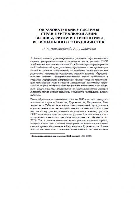 Образовательные системы стран Центральной Азии: вызовы, риски и перспективы регионального сотрудничества Год публикации: 2014 Автор: Nikolay A. Medushevskiy | Alisa R. Shishkina В данной статье рассматривается развитие образовательных систем центральноазиатских государств после распада СССР и обретения ими независимости. Каждая из стран сформироваласвой собственный путь развития образования – от ориентации(порой не слишком продуманной) на западные стандарты до выраженного стремления ограничить внешнее влияние. Образовательные системы центральноазиатских стран нуждаются в серьезной реформации, направленной прежде всего на модернизацию технической базы и учебной литературы, подготовку современных кадров, внедрение международных механизмов и стандартов