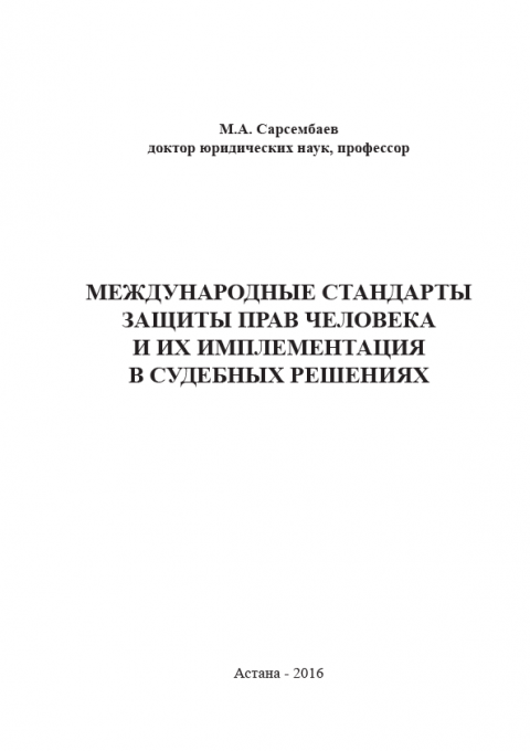 Международные стандарты защиты прав человека и их имплементация в судебных решениях. Год публикации: 2016 Автор: M. A. Sarsembaev Данная книга-пособие посвящена раскрытию темы о международных стандартах защиты прав человека и их имплементации в Казахстане. Здесь предложены к рассмотрению виды международных стандартов защиты прав человека и средства их осуществления. К видам этих международных стандартов отнесены универсальные и региональные, обязательные и рекомендательные международные стандарты прав человека.