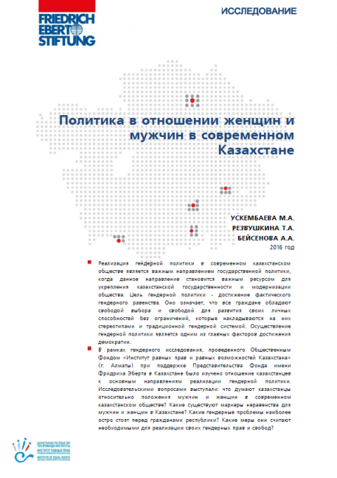Политика в отношении женщин и мужчин в современном Казахстане (краткая версия) Год публикации: 2016 Автор: Margarita A. Uskembaeva | Tatyana A. Rezvushkina | Aygul A. Beysenova Реализация гендерной политики в современном казахстанском обществе является важным направлением государственной политики, когда данное направление становится важным ресурсом для укрепления казахстанской государственности и модернизации общества. Осуществление гендерной политики является одним из главных факторов достижения демократии. В рамках гендерного исследования, проведенного Общественным Фондом «Институт равных прав и равных возможностей Казахстана» (г. Алматы) при поддержке Представительства Фонда имени Фридриха Эберта в Казахстане было изучено отношение казахстанцев к основным направлениям реализации гендерной политики.