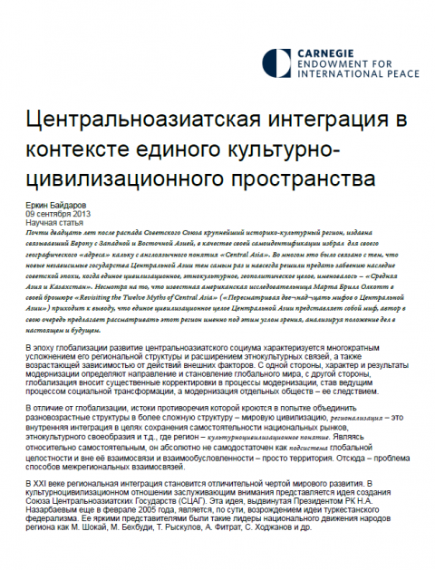 Центральноазиатская интеграция в контексте единого культурно-цивилизационного пространства Год публикации: 2013 Автор: Erkin Baydarov В статье рассматривается перспективы региональной интеграции в Центральной Азии, необходимость понимания единства исторического, культурного и цивилизационного наследия региона.