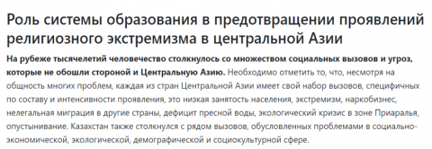 Роль системы образования в предотвращении проявлений религиозного экстремизма в Центральной Азии Год публикации: 2013 Автор: A. Abdirayymova | R. Zharkynbaeva В статье рассматривается роль системы образования предоствращения проявления религиозного экстремизма через призму социального, экономического и культурного развития.