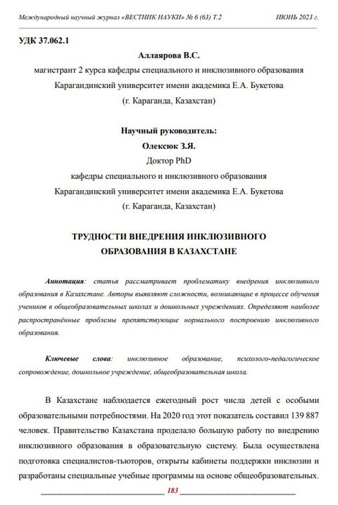 Трудности внедрения инклюзивного образования в Казахстане (Вестник науки; Vol.2, No.6) Год публикации: 2023 Автор: Аллаярова В.С. | Олексюк З.Я. Статья рассматривает проблематику внедрения инклюзивного образования в Казахстане. Авторы выявляют сложности, возникающие в процессе обучения учеников в общеобразовательных школах и дошкольных учреждениях. Определяют наиболее распространённые проблемы препятствующие нормального построению инклюзивного образования.