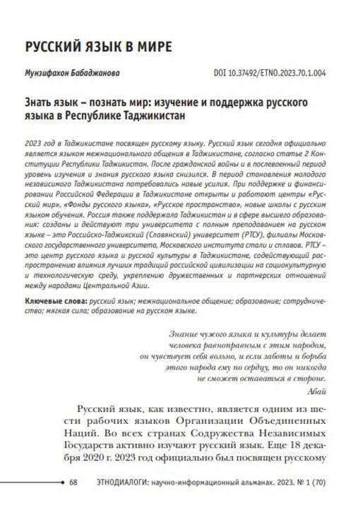 Знать язык - познать мир: изучение и поддержка русского языка в республике Таджикистан (Этнодиалоги; No.1, 2023) Год публикации: 2023 Автор: Мунзифахон Бабаджанова 2023 год в Таджикистане посвящен русскому языку. Русский язык сегодня официально является языком межнационального общения в Таджикистане. При поддержке и финансировании Российской Федерации в Таджикистане открыты и работают центры «Русский мир», «Фонды русского языка», «Русское пространство», новые школы с русским языком обучения. Россия также поддержала Таджикистан и в сфере высшего образования: созданы и действуют три университета с полным преподаванием на русском языке.