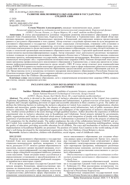Развитие инклюзивного образования в государствах Средней Азии (Балтийский гуманитарный журнал; Том 9; № 4(33) Год публикации: 2020 Автор: Сучков Максим Александрович Организация-автор: Ассоциация «Профессиональные аналитики аутопойэйзисных систем» В статье рассматриваются основные тенденции развития инклюзивного образования в странах Средней Азии (Таджикистане, Казахстане, Кыргызстане, Узбекистане и Туркменистане). Дан общий обзор нормативно-правовых документов, Национальных программ и Концепций, регулирующих вопросы предоставления равного и доступного образования в этих странах.