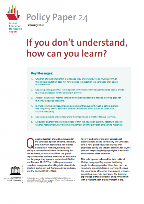 Как вы можете учиться, если вы не понимаете? Год публикации: 2016 Организация-автор: UNESCO Key Messages:1. Children should be taught in a language they understand, yet as much as 40% of the global population does not have access to education in a language they speak or understand.2. Speaking a language that is not spoken in the classroom frequently holds back a child’s learning, especially for those living in poverty.3. At least six years of mother tongue instruction is needed to reduce learning gaps for minority language speakers.4. In multi-ethnic societies, imposing a dominant language through a school system has frequently been a source of grievance linked to wider issues of social and cultural inequality.5. Education policies should recognize the importance of mother tongue learning. 6. Linguistic diversity creates challenges within the education system, notably in areas of teacher recruitment, curriculum development and the provision of teaching materials.