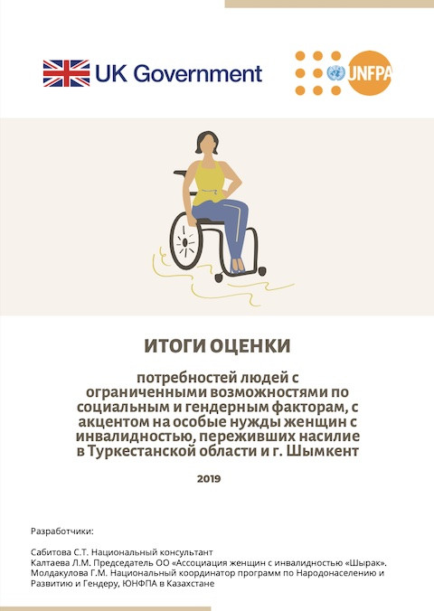 Итоги оценки: Потребностей людей с ограниченными возможностями по социальным и гендерным факторам, с акцентом на особые нужды женщин с инвалидностью, переживших насилие в туркестанской области и Г.шымкент Год публикации: 2020 Организация-автор: ЮНФПА Данный отчет содержит результаты оценки потребностей людей с инвалидностью по социальным и гендерным вопросам, с акцентом на особые нужды женщин с инвалидностью, подвергшихся насилию, в г. Шымкент и в Туркестанской области (в г. Туркестан и в 3-х районах области - Сайрамский, Шардаринский, Сарыагашский).