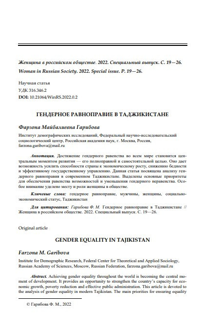 Гендерное равноправие в Таджикистане (Женщина в российском обществе; Специальный выпуск) Год публикации: 2022 Автор: Фарзона Майбалиевна Гарибова Организация-автор: Ивановский государственный университет Достижение гендерного равенства во всем мире становится центральным моментом развития — его полноправной и самостоятельной целью. Оно дает возможность усилить способности страны к экономическому росту, снижению бедности и эффективному государственному управлению. Данная статья посвящена анализу гендерного равноправия в современном Таджикистане. Выделены основные приоритеты для обеспечения равенства возможностей и уменьшения гендерного неравенства. Особое внимание уделено месту и роли женщины в обществе.