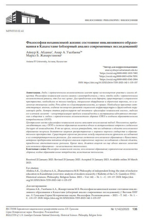 Философия независимой жизни: состояние инклюзивного образования в Казахстане (обзорный анализ современных исследований) (Вестник ЕНУ им. Л.Н. Гумилева. Серия: Исторические науки. Философия. Религиоведение; Vol.142, No.1) Год публикации: 2023 Автор: Абдина Айнур К. | Уызбаева Анар А. | Жанарстанова Марал Б. Люди с ограниченными возможностями имеют право на полноценное участие в жизни общества. Философия независимой жизни связана с самоопределением, с тем, чтобы люди с ограниченными возможностями решали, что для них лучше. Для преодоления ими барьеров, существующих в социальном пространстве, необходимы не только пандусы, специальное оборудование и обученный персонал, но и изменение отношения людей. Речь идет не о благотворительности, а о правах. Необходимо принятие соответствующих законов, создание полноценно развитой социальной инфраструктуры и дружелюбной окружающей среды. Авторы статьи рефлексируют над понятием «философия независимой жизни», выделяя его ключевой момент – концептуализацию проблем инвалидности и выстраивания адекватного отношения в обществе к людям с ограниченными возможностями здоровья (ОВЗ) и особыми образовательными потребностями (ООП). Центральное место в философии независимой жизни занимает инклюзивный подход. Несомненно, проблема адаптации лиц с ООП к системе образования является одним из актуальнейших вопросов в глобальном дискурсе об инвалидности. В то же время, нельзя утверждать, что исследования в области инклюзивного образования получили достаточно широкое распространение в мировом научном сообществе и образовательном пространстве. Существуют огромные различия между национальными уровнями исследований и их интерпретационными рамками. Для выявления состояния инклюзивного образования в Казахстане, авторами предпринята попытка обзорного анализа современных научных исследований в данной области, проведенных отечественными учеными. Кроме того, делается акцент на еще одном важном моменте инклюзивного образования – на ассистивных технологиях.