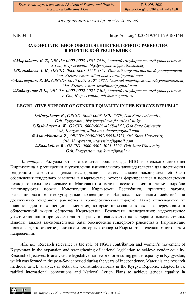Законодательное обеспечение гендерного равенства в Киргизской Республкие (Бюллетень науки и практики; Т. 8. №8.) Год публикации: 2022 Автор: Марзабаева Бакты Токтомаматовна и др. Актуальностью отмечается роль вклада НПО и женского движения Кыргызстана в расширении и укреплении национального законодательства для достижения гендерного равенства. Целью исследования является анализ законодательной базы обеспечения гендерного равенства в Кыргызстане, которая формировалась в постсоветский период за годы независимости.