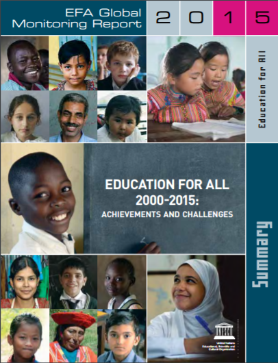 Образование для всех 2000-2015 гг.: достижения и вызовы, всемирный доклад по мониторингу ОДВ, 2015 г., резюме Год публикации: 2015 Организация-автор: UNESCO At the World Education Forum in Dakar, Senegal, in 2000, governments from 164 countries, together with representatives of regional groups, international organizations, donor agencies, non-government organizations (NGOs) and civil society, adopted a Framework for Action to deliver Education for All (EFA) commitments. The Dakar Framework comprised 6 goals and their associated targets to be achieved by 2015, and 12 strategies to which all stakeholders would contribute. The EFA Global Monitoring Report (GMR) has monitored progress on an almost annual basis towards the EFA goals and the two education-related Millennium Development Goals (MDGs). The 2015 GMR provides a complete assessment of progress since 2000 towards the target date for reaching the Dakar Framework’s goals. It takes stock of whether the world achieved the EFA goals and stakeholders upheld their commitments. It explains possible determinants of the pace of progress. Finally, it identifies key lessons for shaping the post-2015 global education agenda.
