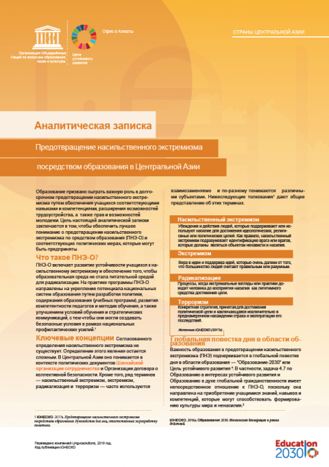 Аналитическая записка: предотвращение насильственного экстремизма посредством образования в Центральной Азии Год публикации: 2019 Организация-автор: UNESCO Almaty Образование призвано сыграть важную роль в долго-срочном предотвращении насильственного экстре-мизма путем обеспечения учащихся соответствующими навыками и компетенциями, расширения возможностейтрудоустройства, а также прав и возможностеймолодежи. Цель настоящей аналитической записки заключается в том, чтобы обеспечить лучшее понимание о предотвращении насильственного экстремизма по средством образования (ПНЭ-О) и соответствующих политических мерах, которые могут быть предприняты.