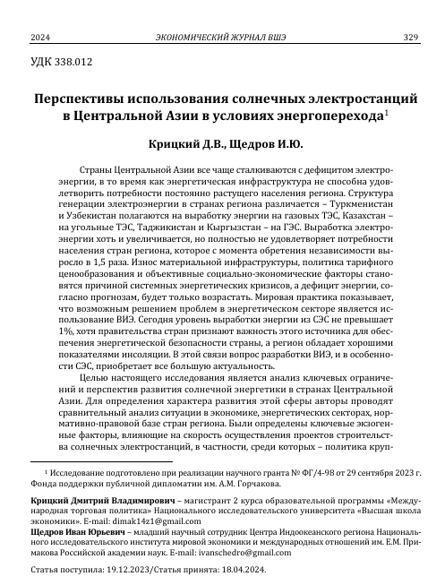 Перспективы использования солнечных электростанций в Центральной Азии в условиях энергоперехода (Экономический журнал ВШЭ, Том 28, №2) Год публикации: 2024 Автор: Крицкий Дмитрий | Щедров Иван Целью настоящего исследования является анализ ключевых ограничений и перспектив развития солнечной энергетики в странах Центральной Азии. Для определения характера развития этой сферы авторы проводят сравнительный анализ ситуации в экономике, энергетических секторах, нормативно-правовой базе стран региона.