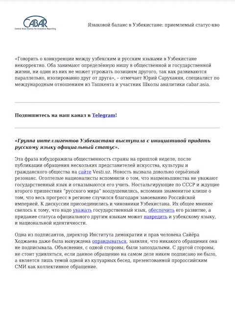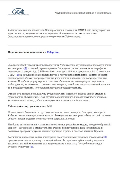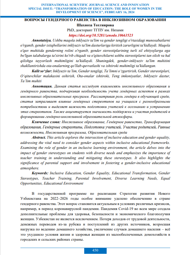 Международное техническое и программное руководство по внешкольному комплексному сексуальному образованию: Информационно-доказательный подход для неформальных внешкольных программ Год публикации: 2020 Организация-автор: United Nations Population Fund (UNFPA) Данное Руководство дополняет «Международное техническое руководство по сексуальному образо- ванию», опубликованное в 2018 году, и разработано на его основе. В данном издании для внешкольных программ, которое опирается на факты и использует правозащитный подход, даны конкретные инструкции и рекомендации, которые помогут наиболее уязвимым категориям молодых людей расширить свои знания и навыки, необходимые для принятия взвешенных решений, касающихся сексуального и репродуктивного здоровья.  Хрупкий баланс языковых споров в Узбекистане Год публикации: 2020 Автор: Eldar Asanov Организация-автор: Central Asian Bureau for Analytical Reporting (CABAR) | Institute for War and Peace Reporting (IWPR) Узбекистанский исследователь Эльдар Асанов в статье для CABAR.asia дискутирует об идентичности, национализме и исторической памяти в контексте довольно болезненного языкового вопроса в современном Узбекистане.  Языковой баланс в Узбекистане: Приемлемый статус-кво Год публикации: 2019 Автор: Yuriy Sarukhanyan Организация-автор: Central Asian Bureau for Analytical Reporting (CABAR) | Institute for War and Peace Reporting (IWPR) «Говорить о конкуренции между узбекским и русским языками в Узбекистане некорректно. Оба занимают определённую нишу в общественной и государственной жизни, ни один из них не может угрожать позициям другого, так как развиваются параллельно, изолированно друг от друга», – отмечает Юрий Саруханян, специалист по международным отношениям из Ташкента и участник Школы аналитики cabar.asia.  Языковая политика стран Центральной Азии Год публикации: 2020 Автор: Nurbek Bekmurzayev Организация-автор: Central Asian Bureau for Analytical Reporting (CABAR) | Institute for War and Peace Reporting (IWPR) Аналитическая записка “Языковая политика стран Центральной Азии” представлена совместно IWPR и CABAR.asia. В публикации изложены пути становления государственных языков в странах Центральной Азии, проанализировано их функционирование наряду с русским языком, сделаны выводы и прогнозы на будущее и предоставлены рекомендации для улучшения языковой политики.Публикация предназначена для молодых экспертов и консультантов, исследователей, лиц, принимающих управленческие решения, а также широкого круга читателей.  Совершенствование механизмов, обеспечивающих достижение гендерного равенства в Узбекистане Год публикации: 2024 Автор: Отеев Уразбай | Каражанова Роза Организация-автор: Наука и инновации В этой статье исследуется развитие гендерного равенства в Узбекистане, освещается достигнутый к настоящему времени прогресс, определяются текущие проблемы и обрисовываются дальнейшие пути построения более инклюзивного общества.  Вопросы гендерного равенства в инклюзивном образовании Год публикации: 2024 Автор: Шахноза Тохтиярова Организация-автор: Наука и ииновации Данная статья исследует взаимосвязь инклюзивного образования и гендерного равенства, подчеркивая необходимость учета гендерных аспектов в рамках инклюзивных образовательных программ. Рассматривая роль гендера в обучающей среде, статья затрагивает влияние гендерных стереотипов на учащихся с разнообразными потребностями и выделяет важность подготовки учителей к осознанию и устран