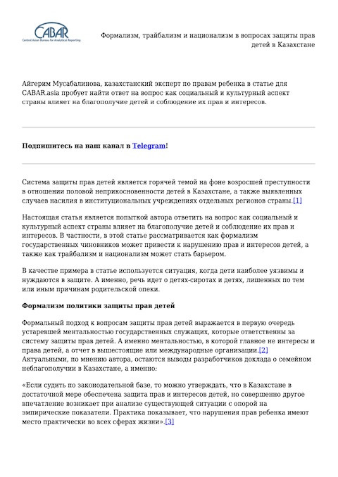Curriculum globALE: Рамка компетенций преподавателей для взрослых Год публикации: 2021 Организация-автор: DVV International | German Institute for Adult Education, Leibniz Centre for Lifelong Learning | International Council for Adult Education | UNESCO Institute for Lifelong Learning (UIL) В этой публикации представлена ​​Curriculum globALE, базовая система компетенций для подготовки педагогов для взрослых во всем мире. Предлагая модульную структуру, основанную на компетенциях, и междисциплинарный подход, Curriculum globALE ​​уникален своей целью сделать обучение и образование взрослых (ALE) профессиональным в международном масштабе с помощью компетенций, которые помогают преподавателям для взрослых работать в любой образовательной среде, поле или форма. Он стремится обеспечить, чтобы знания, компетенции, навыки и отношение педагогов соответствовали профессиональному стандарту. Curriculum globALE ​​подходит для различных контекстов, а его характер и структура позволяют включать его в различные национальные системы образования. Учебный план globALE ​​направлен на:   повышать профессионализацию ООВ путем предоставления общей справочной системы для программ обучения взрослых и предлагаемого стандарта компетенций для преподавателей для взрослых  оказывать поддержку провайдерам ООВ в разработке и реализации программ «обучения инструкторов»  способствовать обмену знаниями и взаимопониманию между педагогами для взрослых во всем мире.   Международное техническое и программное руководство по внешкольному комплексному сексуальному образованию: Информационно-доказательный подход для неформальных внешкольных программ Год публикации: 2020 Организация-автор: United Nations Population Fund (UNFPA) Данное Руководство дополняет «Международное техническое руководство по сексуальному образо- ванию», опубликованное в 2018 году, и разработано на его основе. В данном издании для внешкольных программ, которое опирается на факты и использует правозащитный подход, даны конкретные инструкции и рекомендации, которые помогут наиболее уязвимым категориям молодых людей расширить свои знания и навыки, необходимые для принятия взвешенных решений, касающихся сексуального и репродуктивного здоровья.  Пандемия может обнажить социальный протест в Центральной Азии Год публикации: 2020 Автор: Alexey Malashenko Организация-автор: Russian International Affairs Council Коронавирус стал серьезным тестом на прочность политических систем стран Центральной Азии. Несмотря на серьезные социально-экономические последствия пандемии, стабильность была обеспечена. Но в долгосрочной перспективе карантин и введенные жесткие ограничения напомнят о себе и обнажат старые проблемы. Среди наиболее острых из них — безработица и угроза насильственного экстремизма. Причем обе проблемы связаны.  Правам человека в Узбекистане нужен свой Навруз Год публикации: 2021 Автор: Steve Swerdlow Организация-автор: Central Asian Bureau for Analytical Reporting (CABAR) Старые авторитарные привычки Ташкента препятствуют позитивному прогрессу. В преддверии Навруза, юрист по правам человека Стив Свердлов в статье для CABAR.asia рассуждает о необходимости перемен в правовой сфере Узбекистана.  Семейное насилие в Таджикистане: Какие меры нужны чтобы помочь жертвам? Год публикации: 2021 Автор: Shokhsanam Shodiyeva Организация-автор: Central Asian Bureau for Analytical Reporting (CABAR) В данном статье автор обсуждает текущее состояние дел в Таджикистане в области предотвращения домашнего 