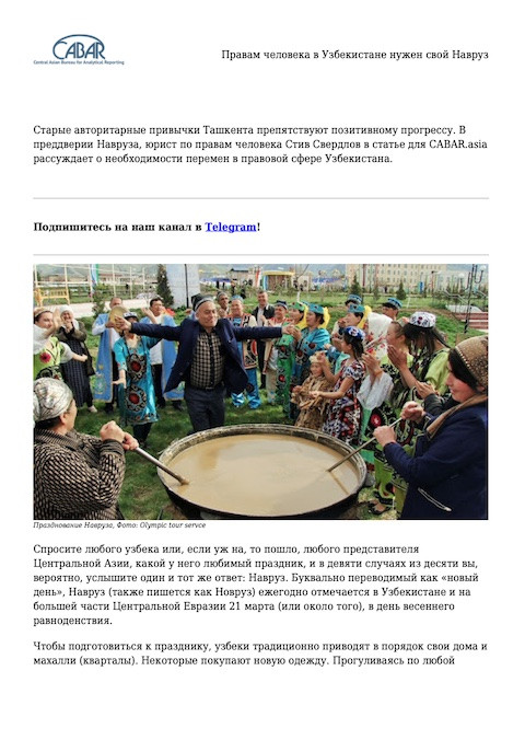 Правам человека в Узбекистане нужен свой Навруз Год публикации: 2021 Автор: Steve Swerdlow Организация-автор: Central Asian Bureau for Analytical Reporting (CABAR) Старые авторитарные привычки Ташкента препятствуют позитивному прогрессу. В преддверии Навруза, юрист по правам человека Стив Свердлов в статье для CABAR.asia рассуждает о необходимости перемен в правовой сфере Узбекистана.