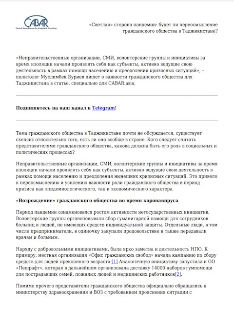 «Светлая» сторона пандемии: будет ли переосмысление гражданского общества в Таджикистане? Год публикации: 2020 Автор: Muslimbek Buriev Организация-автор: Central Asian Bureau for Analytical Reporting (CABAR) | Institute for War and Peace Reporting (IWPR) «Неправительственные организации, СМИ, волонтерские группы и инициативы за время изоляции начали проявлять себя как субъекты, активно ведущие свою деятельность в рамках помощи населению и преодоления кризисных ситуаций», – политолог Муслимбек Буриев пишет о важности гражданского общества для Таджикистана в статье, специально для CABAR.asia.