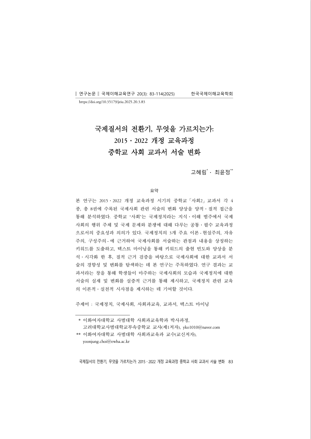 국제질서의 전환기, 무엇을 가르치는가: 2025, 2022 개정 교육과정 중학교 사회 교과서 서술 변화 (국제이해교육연구; Vol. 20, No. 3) 出版年份: 2025 作者: 고혜림 | 최윤정 机构作者: 한국국제이해교육학회 본 연구는 2015, 2022 개정 교육과정 시기의 중학교「사회2」교과서 각 4종, 총 8권에 수록된 국제사회 관련 서술의 변화 양상을 양적․질적 접근을 통해 분석하였다. 중학교 ‘사회’는 국제정치라는 지식․이해 범주에서 국제사회의 행위 주체 및 국제 문제와 분쟁에 대해 다루는 공통․필수 교육과정으로서의 중요성과 의의가 있다. 국제정치의 3개 주요 이론-현실주의, 자유주의, 구성주의-에 근거하여 국제사회를 서술하는 관점과 내용을 상징하는 키워드를 도출하고, 텍스트 마이닝을 통해 키워드의 출현 빈도와 양상을 분석․시각화 한 후, 질적 근거 검증을 바탕으로 국제사회에 대한 교과서 서술의 경향성 및 변화를 탐색하는 데 본 연구는 주목하였다. 연구 결과는 교과서라는 창을 통해 학생들이 마주하는 국제사회의 모습과 국제정치에 대한 서술의 실재 및 변화를 실증적 근거를 통해 제시하고, 국제정치 관련 교육의 이론적․실천적 시사점을 제시하는 데 기여할 것이다.