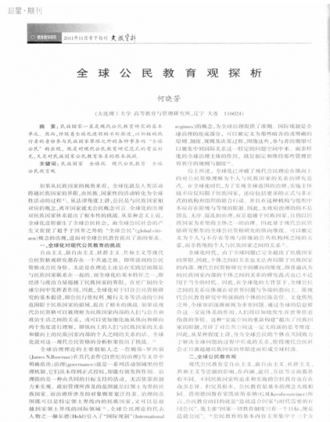 全球公民教育观探析 出版年份: 2011 作者: He Xiaofang 民族国家一直是现代公民教育研究的基本单元。然而,伴随着全球化进程的不断推进,以积极的践行者的身份参与民族国家界限之外的各种事务的“全球公民”的出现,既是对现代公民教育研究范式的有益补充,又是对民族国家公民教育体系的根本挑战。