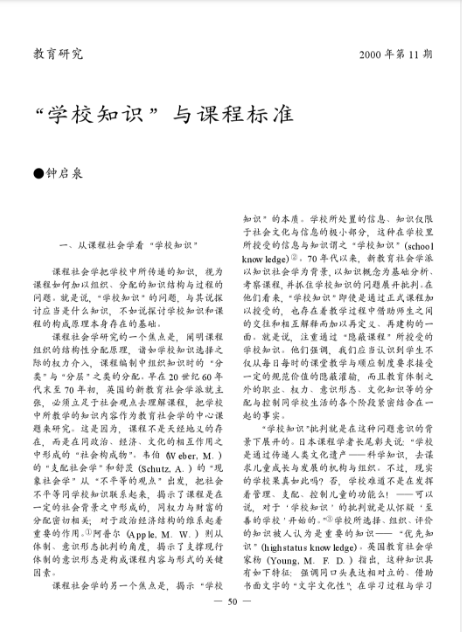 学校知识与课程标准 出版年份: 2000 作者: Zhong Qiquan 基于课程社会学,对于学校知识的批判增加。文章首先讨论了中国和日本的教育问题,并强调了“素质价值”与课程标准间的重要关系。文章讨论了课程构成的四要素:课程目标、课程内容、课程实施和课程评价,及其与课程标准编制的关系。