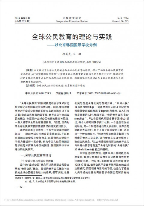 道德教育与“积极公民”的培育—从以赛亚・伯林的两种自由概念谈起 出版年份: 2019 作者: Ye Fei 机构作者: Soochow University 以赛亚·伯林在两种自由概念的基础上提出了“消极公民”和“积极公民”两种人格观念。“消极公民”倾向于将个体的自由和权利置于共同体之上,把捍卫个体的自由视为第一要务,这容易导致个体与共同体之 间的分裂与疏离; 而“积极公民”则更强调自由与责任、个体与社会的交融,主张个体在捍卫个人权利的同时也要勇于担当公共责任。在当前的社会转型期,不论是从个体品格完善、学校德育改革还是从社会发展等角度而言,道德教育都有必要引导“积极公民”的培育,推动道德责任感和公共精神的发展。为此,道德教育应致力于建构课堂的公共生活空间,发展学校的民主共治理念,同时实现学校生活与社区生活的有效联结,从而培育学生的平等、合作、尊重、宽容等公共道德品质,使其成长为负责任的积极公民,在实现自我的品格完善的同时促进公共社会的发展。