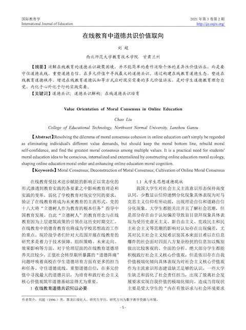 在线教育中道德共识价值取向 (国际教育学; vol. 3, no. 2) 出版年份: 2021 作者: Chao Liu 本文探讨了在线教育道德哲学,并讨论了如何实现在线教育的道德共识。