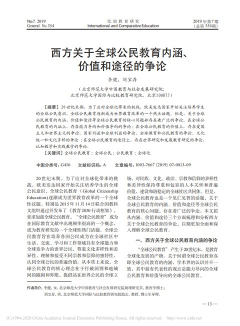 西方关于全球公民教育内涵、价值和途径的争论 (比较教育研究; No. 7) 出版年份: 2019 作者: Lijian | Liu Baocun 机构作者: Beijing Normal University 20世纪末期,为了应对全球化带来的挑战,欧美发达国家开始关注培养学生的全球公民意识,全球公民教育逐渐成为世界教育改革的一个热点话题。但是,关于全球公民教育的内涵、价值和途径等全球公民教育的核心问题却存在着广泛的争论。在全球公民教育的内涵上,存在能力导向和价值导向的争论 ;在全球公民教育的价值上,存在爱国主义和世界主义的争论、国家利益和全球利益的争论、全球教育和公民教育的争论、文化统一和文化多样的争论 ;在全球公民教育的途径上,存在世界研究和发展教育研究的争论、认知教学和实践教学的争论。