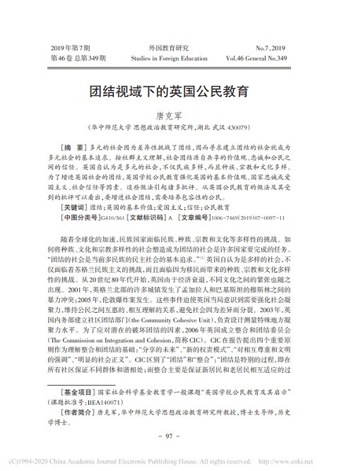 团结视域下的英国公民教育 (外国教育研究; Vol. 46, No. 7) 出版年份: 2019 作者: Tang Kejun 机构作者: Northeast Normal University 多元的社会因为差异性挑战了团结,因而寻求建立团结的社会就成为多元社会的基本追求。按社群主义理解,社会团结源自共享的价值观、忠诚和公民之间的信任。英国自认为是多元的社会,不仅民族多样,而且种族、宗教和文化多样。为了增进英国社会的团结,英国学校公民教育强化英国的基本价值观、国家忠诚或爱 国主义、社会信任等因素。这些做法引起诸多批评。从英国公民教育的做法及其受 到的批评可以看出,要增进社会团结,需要培养包容性的公民。