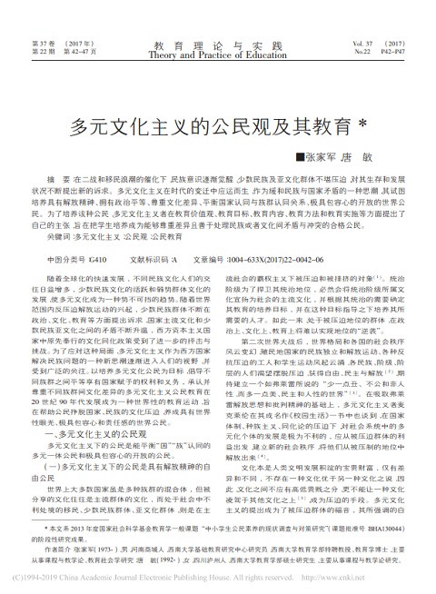 多元文化主义的公民观及其教育 (教育理论与实践; Vol. 37, No. 22) 出版年份: 2017 作者: Zhang Jiajun | Tang Min 机构作者: Shanxi Education Association 在二战和移民浪潮的催化下,民族意识逐渐觉醒,少数民族及亚文化群体不堪压迫,对其生存和发展状况不断提出新的诉求。多元文化主义在时代的变迁中应运而生,作为缓和民族与国家矛盾的一种思潮,其试图培养具有解放精神、拥有政治平等、尊重文化差异、平衡国家认同与族群认同关系、极具包容心的开放的世界公民。为了培养该种公民,多元文化主义者在教育价值观、教育目标、教育内容、教育方法和教育实施等方面提出了自己的主张,旨在把学生培养成为能够尊重差异且善于处理民族或者文化间矛盾与冲突的合格公民。