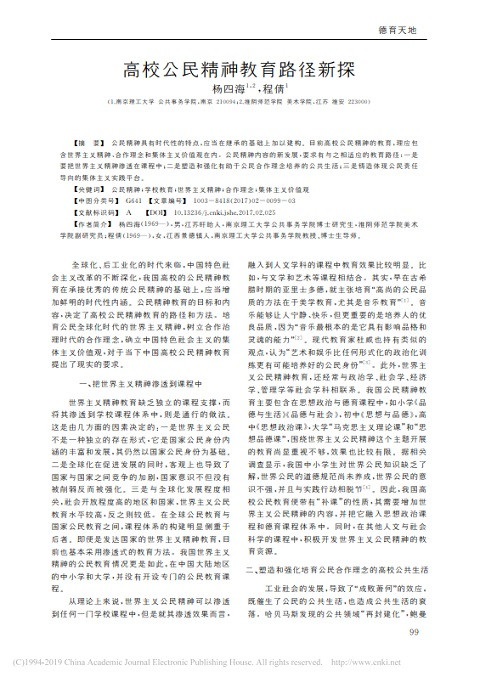 高校公民精神教育路径新探 (江苏高教; No. 2) 出版年份: 2017 作者: Yang Sihai | Cheng Qian 机构作者: Jiangsu Education Press 公民精神具有时代性的特点,应当在继承的基础上加以建构。目前高校公民精神的教育,理 应 包 含世界主义精神、合作理念和集体主义价值观在内。公民精神内容的新发展,要求有与之相适应的教育路径:一是 要把世界主义精神渗透在课程中;二是塑造和强化有助于公民合作理念培养的公共生活;三是铸造体现公民责任 导向的集体主义实践平台。