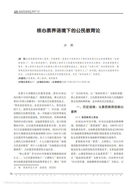 核心素养语境下的公民教育论 (教育科学研究) 出版年份: 2017 作者: Wang Min 机构作者: Beijing Open University 从素质教育到核心素养,中国教育一直致力于培养符合个体终身发展与社会发展需要的“全面 发展的人”。核心素养语境下,厘清核心素养与公民教育的逻辑关系是很有必要的。在对素质教育之 要旨、核心素养之追求和公民教育之要义的内涵解读基础上,通过对“合格公民”的法律规定性、教 育规定性和现实规定性的理论反思,尝试回答公民教育“培养什么人”的问题;通过对公民教育学科 定位、公民教育课程实施与公民教育评价制度的思考,寻求“如何培养人”的路径。