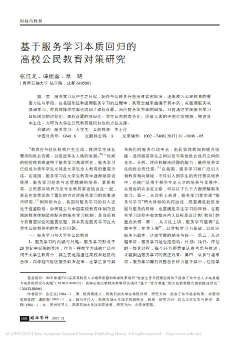 基于服务学习本质回归的高校公民教育对策研究 (理论导刊) 出版年份: 2017 作者: Zhang Jianglong | Tan Zuxue | Zhang Xiao 机构作者: Shaanxi Provincial Party School of the Communist Party of China 服务学习从产生之日起,始终与公民责任感培育紧密联系,逐渐成为公民教育的重 要方法与手段。在我国引进和运用服务学习的过程中,其理念越来越偏于其本质,或强调服务或 强调学习,在具体操作层面也遇到了课程设置、角色整合等方面的困境。只有通过实现服务学习 目标理念的过程化、课程设置的项目化、学生反思的常态化、价值元素的中国化等措施,推进其 本土化,方可为大学生公民教育提供有效的方法支撑。