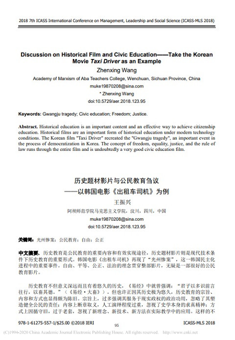 历史题材影片与公民教育刍议: 以韩国电影《出租车司机》为例 (智能信息技术应用学会会议论文集) 出版年份: 2018 作者: Zhenxing Wang 机构作者: ICASS International Conference on Management, Leadership and Social Science 历史教育是公民教育的重要内容和有效实现途径,历史题材影片则是现代技术条件下历史教育的重要形式。韩国电影《出租车司机》再现了"光州惨案",这一韩国民主化进程中的重要事件。自由、平等、公正、法治的理念贯穿整部影片,无疑是一部很好的公民教育影片。