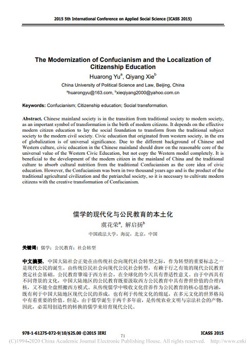 儒学的现代化与公民教育的本土化 (智能信息技术应用学会会议论文集) 出版年份: 2015 作者: Huarong Yua | Qiyang Xie 机构作者: International Conference on Applied Social Science 中国大陆社会正处在由传统社会向现代社会转型之际,作为转型的重要标志之一 是现代公民的诞生。由传统臣民社会向现代公民社会转型,有赖于行之有效的现代公民教育 奠定社会基础。公民教育肇端于西方社会,在全球化的今天具有普适性意义。由于中西具有 不同背景的文化,中国大陆地区的公民教育既要汲取西方公民教育中具有普世价值的合理内 核,又不能全盘照搬西方模式。从传统儒学中吸收文化营养作为公民教育的核心思想内涵, 既有利于中国大陆地区现代公民的养成,也有利于传统文化的绵延,在多元文化的世界格局 中有着重要的价值。但是,由于儒学诞生于两千多年前,是传统农业文明与宗法社会的产物, 因此,必需用创造性的转换的儒学来培育现代公民。