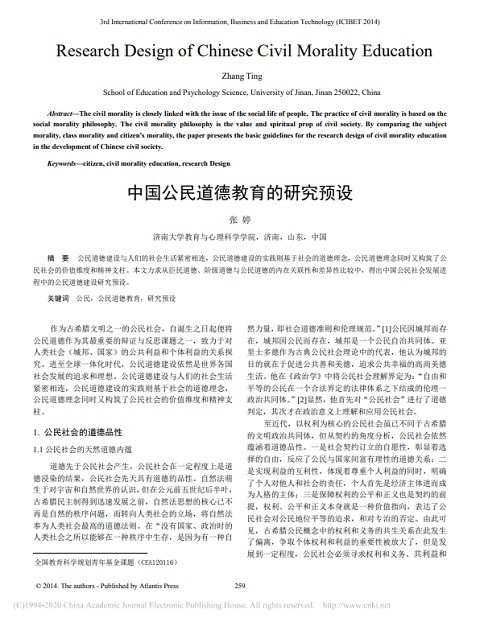 中国公民道德教育的研究预设 (北京欣永顺文化传播有限公司会议论文集) 出版年份: 2014 作者: Zhang Ting 机构作者: International Conference on Information, Business and Education Technology 公民道德建设与人们的社会生活紧密相连,公民道德建设的实践则基于社会的道德理念,公民道德理念同时又构筑了公民社会的价值维度和精神支柱。本文力求从臣民道德、阶级道德与公民道德的内在关联性和差异性比较中,得出中国公民社会发展进 程中的公民道德建设研究预设。