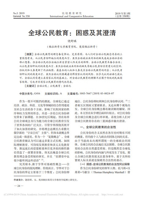 全球公民教育:困惑及其澄清 (比较教育研究; No. 3) 出版年份: 2019 作者: Rao Shuqi 机构作者: Beijing Normal University 全球公民教育的理念备受争议,究其原因,与人们对全球公民概念存在的三 重困惑有关。从公民身份即地位的角度而言,虽然全球政治共同体的缺失造成全球社会的 难以想象,但全球公民的合法地位源自紧密人际关系的保障,全球公民教育具备合法性 ; 从公民身份即权利的角度而言,虽然全球政治共同体的缺失导致公民身份实质意义的空洞, 但权利和义务更新了内涵版图,最基本的人权和义务充实全球公民教育的内容 ;从公民身 份即认同的角度而言,虽然全球认同潜藏着消弭国家认同的风险,但多元认同话语已获认 可,全球认同需建立在国家认同的基础上。对全球公民教育的理解不应囿于传统的民族国 家框架,它也并非国家公民教育的替代性存在。
