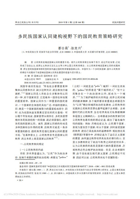 多民族国家认同建构视野下的国民教育策略研究 (黑龙江民族丛刊; No. 1) 出版年份: 2019 作者: Du Richen | Zhang Jingyue 机构作者: Heilongjiang National Research Institute 公民教育是增进国家认同的重要手段。现代公民教育理念发端于西方,经过历史发展,已经 形成了自由主义、社群主义和多元文化主义等三种主要公民教育理念。从公民教育增进国家认同的实践来 看,原生型民族国家和移民型民族均通过国民教育增强国家认同。中国作为一个多民族国家,国外公民教育 的理论与实践对于我国增进国家认同具有重要的借鉴与启示意义。