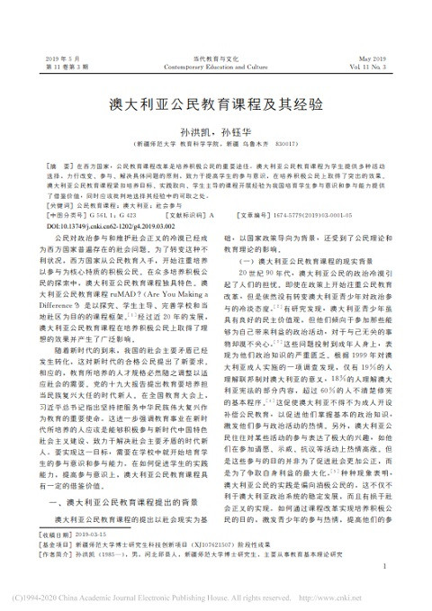澳大利亚公民教育课程及其经验 (当代教育与文化; Vol. 11, No. 3) 出版年份: 2019 作者: Sun Hongkai | Sun Yuhua 机构作者: Northwest Normal University 在西方国家,公民教育课程改革是培养积极公民的重要途径。澳大利亚公民教育课程为学生提供多种活动 选择,力行改变、参与、解决具体问题的原则,致力于提高学生的参与意 识,在培养积极公民上取得了突出的效果。澳大利亚公民教育课程紧扣培养目标、实践取向、学生主导的课程开展经验为我国培育学生参与意识和参与能力提供 了借鉴价值,同时应该批判地选择其经验中的可取之处。