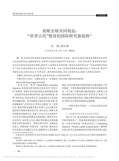 着眼全球共同利益:‘世界公民’教育的国际研究新趋势” (现代教育管理; No. 2) 出版年份: 2018 作者: Song Qiang | Rao Congman 机构作者: Liaoning Institute of Education 全球化对民族国家开展的传统公民教育提出了挑战。全球公民教育发展需要将教育和知识视 为全球共同利益,超越短期利益,推进学习者成为2030年的“世界公民”。当前“世界公民”教育研究本着全 球利益与国家利益的辩证逻辑,聚焦在“人权保护与共同发展”“国家认同到世界认同”“全球治理到世界政 府”“西方式普适思想与多元文明共生”四个方面。为此,我国公民教育要加强社会主义“国家公民”教育中 的国家认同;培养社会主义“世界公民”,提升国际话语权;寻求人类共同利益,构建“人类命运共同体”。
