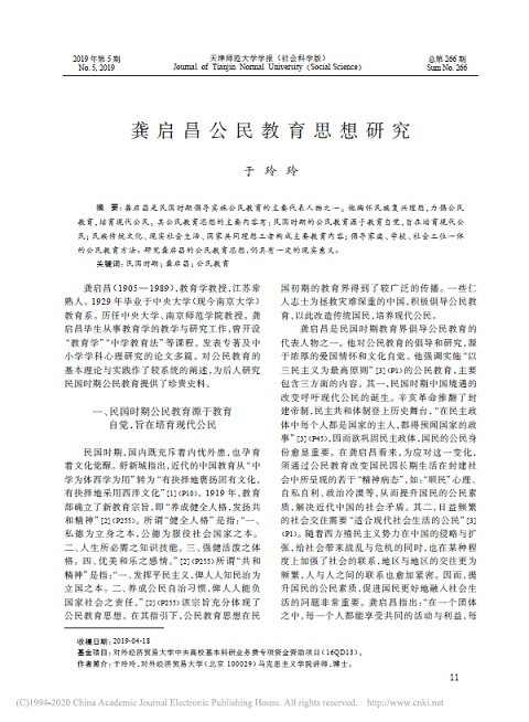 龚启昌公民教育思想研究 (天津师范大学学报:社会科学版; No 5) 出版年份: 2019 作者: Yu Lingling 机构作者: Tianjin Normal University 龚启昌是民国时期倡导实施公民教育的主要代表人物之一。他胸怀民族复兴理想,力倡公民 教育,培育现代公民。其公民教育思想的主要内容有:民国时期的公民教育源于教育自觉,旨在培育现代公 民;民族传统文化、现实社会生活、国家共同理想三者构成主要教育内容;倡导家庭、学校、社会三位一体 的公民教育方法。研究龚启昌的公民教育思想,仍具有一定的现实意义。