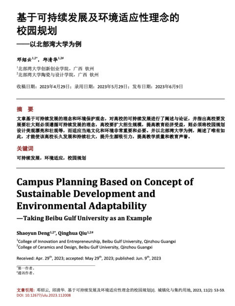 基于可持续发展及环境适应性理念的校园规划: 以北部湾大学为例 (城镇化与集约用地; Vol.11, No.2) 出版年份: 2023 作者: 邓绍云 | 邱清华 文章基于可持续发展的理念和环境保护观念,对高校的可持续发展进行了阐述与论证,并指出高校要发展要壮大则必须遵循可持续发展的理念,高校要扩大招生规模,提高教育经济受益,则必须将校园规划设计美观漂亮和壮观等,而适应当地文化和环境非常重要和必要。并以北部湾大学为例,阐述了唯有如此,才能使该高校长久发展和持续壮大,提升生源吸引力,提高教学质量和教育声誉。
