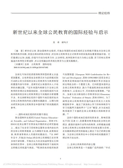 新世纪以来全球公民教育的国际经验与启示 (上海教育科研) 出版年份: 2019 作者: Wuxi | Thomas Tse 机构作者: Shanghai Educational Research 新世纪以来,联合国教科文组织、乐施会等国际或地区组织正在积极开展有关全球公民 教育的教学实践,突显出相似的取向特征,对全球公民教育在正式教育中的实施具有重要借鉴价值。它 们强调以认知、技能、价值与行动为培养方向,以多样性、批判性和行动力为核心议题,学习目标从简单 描述向批判性分析进阶,并以全校融合的系统化教学为主要实践模式。