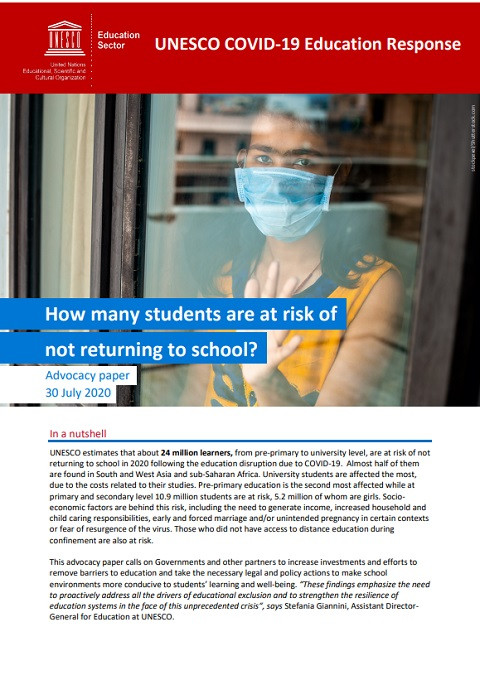 UNESCO COVID-19 Education Response: How Many Students Are at Risk of Not Returning to School?; Advocacy paper 出版年份: 2020 机构作者: UNESCO UNESCO estimates that about 24 million learners, from pre-primary to university level, are at risk of not returning to school in 2020 following the education disruption due to COVID-19. Almost half of them are found in South and West Asia and sub-Saharan Africa. University students are affected the most, due to the costs related to their studies. Pre-primary education is the second most affected while at primary and secondary level 10.9 million students are at risk, 5.2 million of whom are girls. Socioeconomic factors are behind this risk, including the need to generate income, increased household and child caring responsibilities, early and forced marriage and/or unintended pregnancy in certain contexts or fear of resurgence of the virus. Those who did not have access to distance education during confinement are also at risk. This advocacy paper calls on Governments and other partners to increase investments and efforts to remove barriers to education and take the necessary legal and policy actions to make school environments more conducive to students’ learning and well-being. “These findings emphasize the need to proactively address all the drivers of educational exclusion and to strengthen the resilience of education systems in the face of this unprecedented crisis“, says Stefania Giannini, Assistant DirectorGeneral for Education at UNESCO.